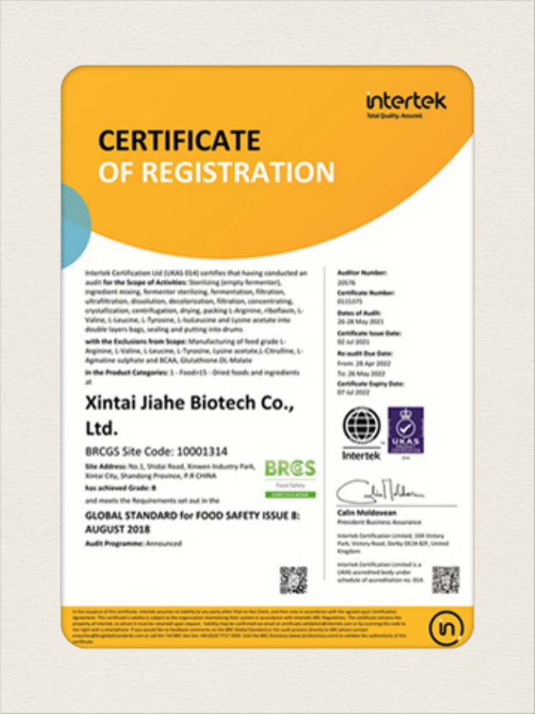 汕頭佳禾生物科技有限公司是一家致力于氨基酸及其衍生物研發(fā)、生產和銷售的國家高新技術企業,先后通過了國家藥品GMP認證,ISO9001質量體系認證、ISO14001環(huán)境管理體系認證。目前,公司擁有“廣東省專精特新中小企業”、“廣東省氨基酸產品工程技術研究中心”、“汕頭市生物發(fā)酵工程技術研究開發(fā)中心”、“汕頭市知識產權優(yōu)勢企業”、“多項國家發(fā)明專利”、“廣東省守合同重信用企業”等多項資質和榮譽,旗下“佳禾牌”系列產品已成為原料藥行業知名品牌。 新泰市佳禾生物科技有限公司成立于2012年8月,注冊資金2億元,公司位于山東泰安新泰市新汶工業園區,是國 家級高新技術企業、山東省“專精特新”企業、山東省制造業單項冠軍企業、泰安市科技型中小企業、泰安市農業產業化龍頭企業、中國生物發(fā)酵產業協會理事單位。